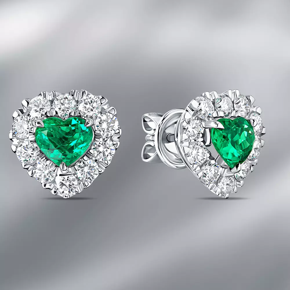 BOVE: Diamond ring set with 4.05 carats of “No Oil” Emerald and pair of diamond ear studs set with 2.53 carats of “No Oil” Emeralds.